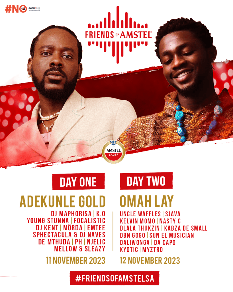 To round off the star-studded #FriendsOfAmstelSA local line up, Amstel is proud to announce that Afrobeats superstars Omah Lay and Adekunle Gold will be headlining this year’s 2-day Friends of Amstel premium lifestyle experience scheduled to take place on the 11th and 12th of November in Gauteng.