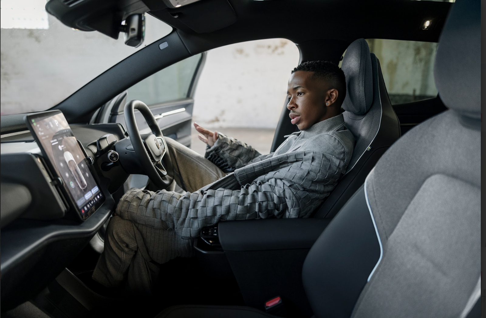 The car’s interior features materials such as renewable linseed fibre, mats from recycled fishing nets, and inlays from upcycled denim—all curated to blend luxury with responsible design. “I got the volume idea for the design from AI which gave me the concept of proportions,” says Mofammere. “I wanted to create something for Lasizwe that was strong and powerful but still played with gender roles. I also wanted him to feel comfortable.”