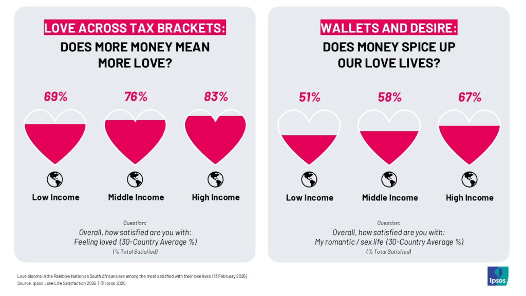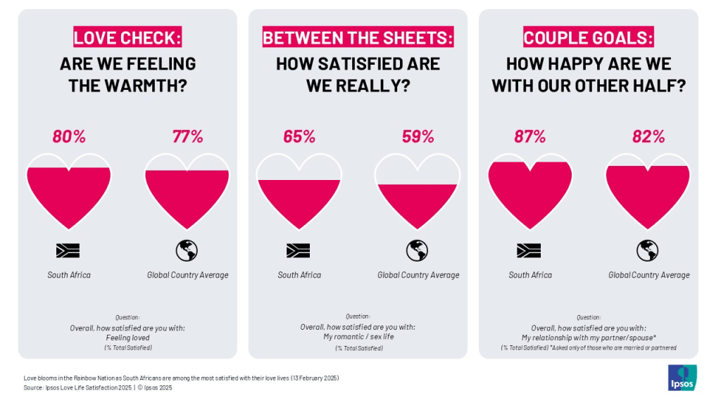 An IPSOS survey revealed that South Africans are more satisfied with their love lives than the internet would suggest. 80% of South Africans report being satisfied with the love in their lives, above the global average.